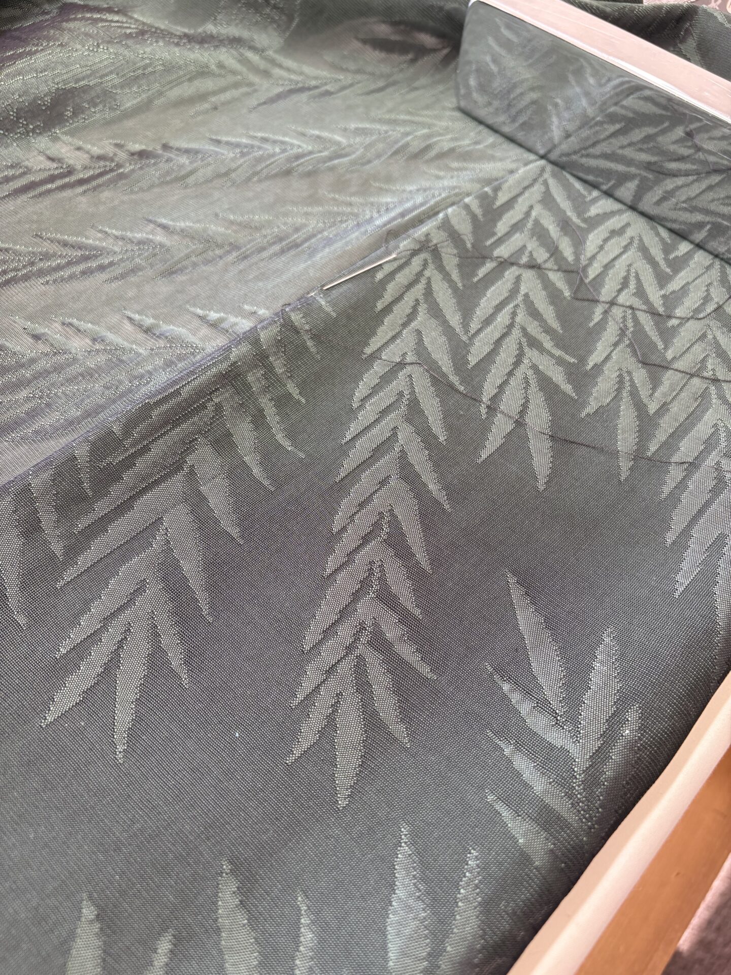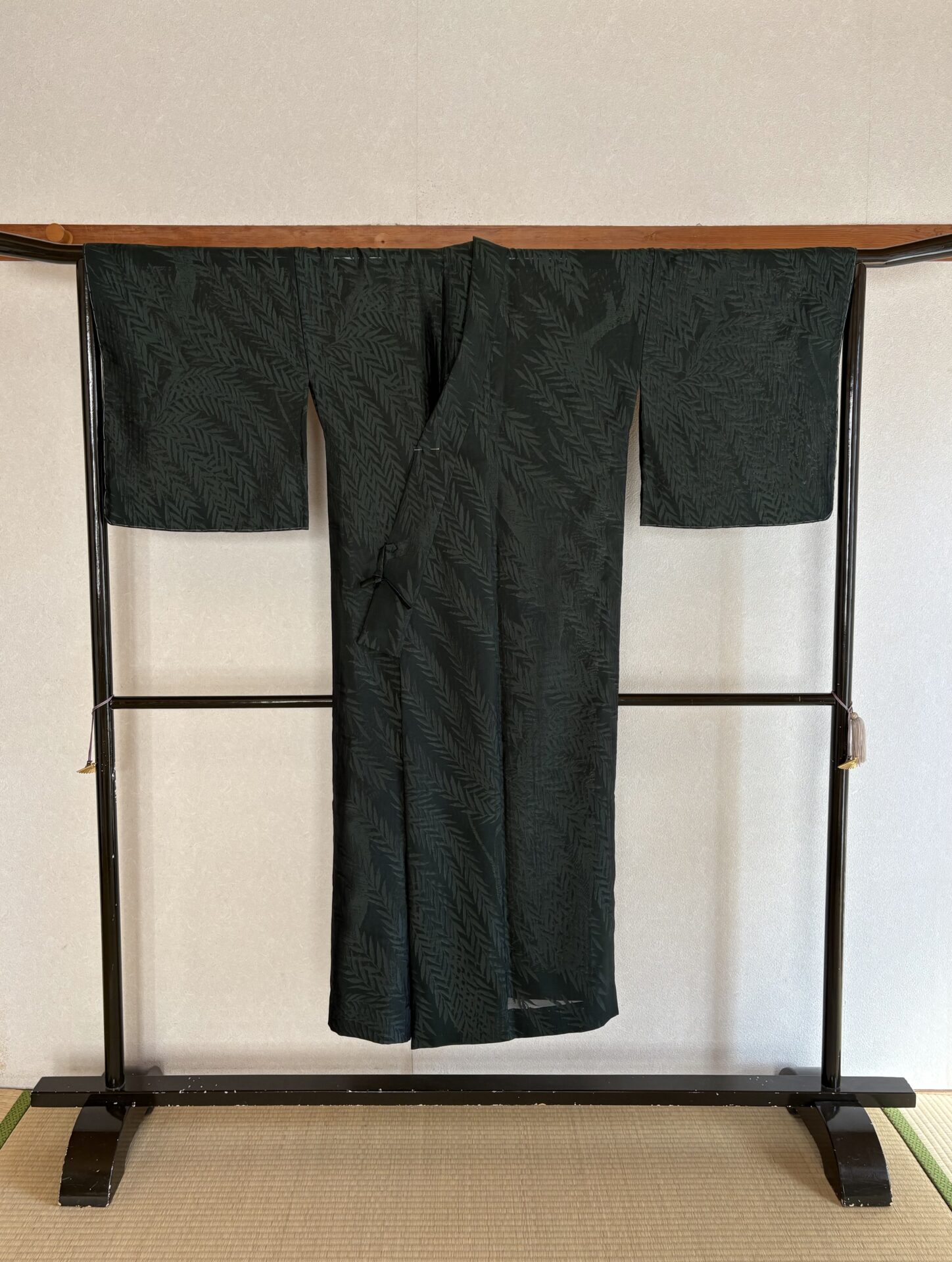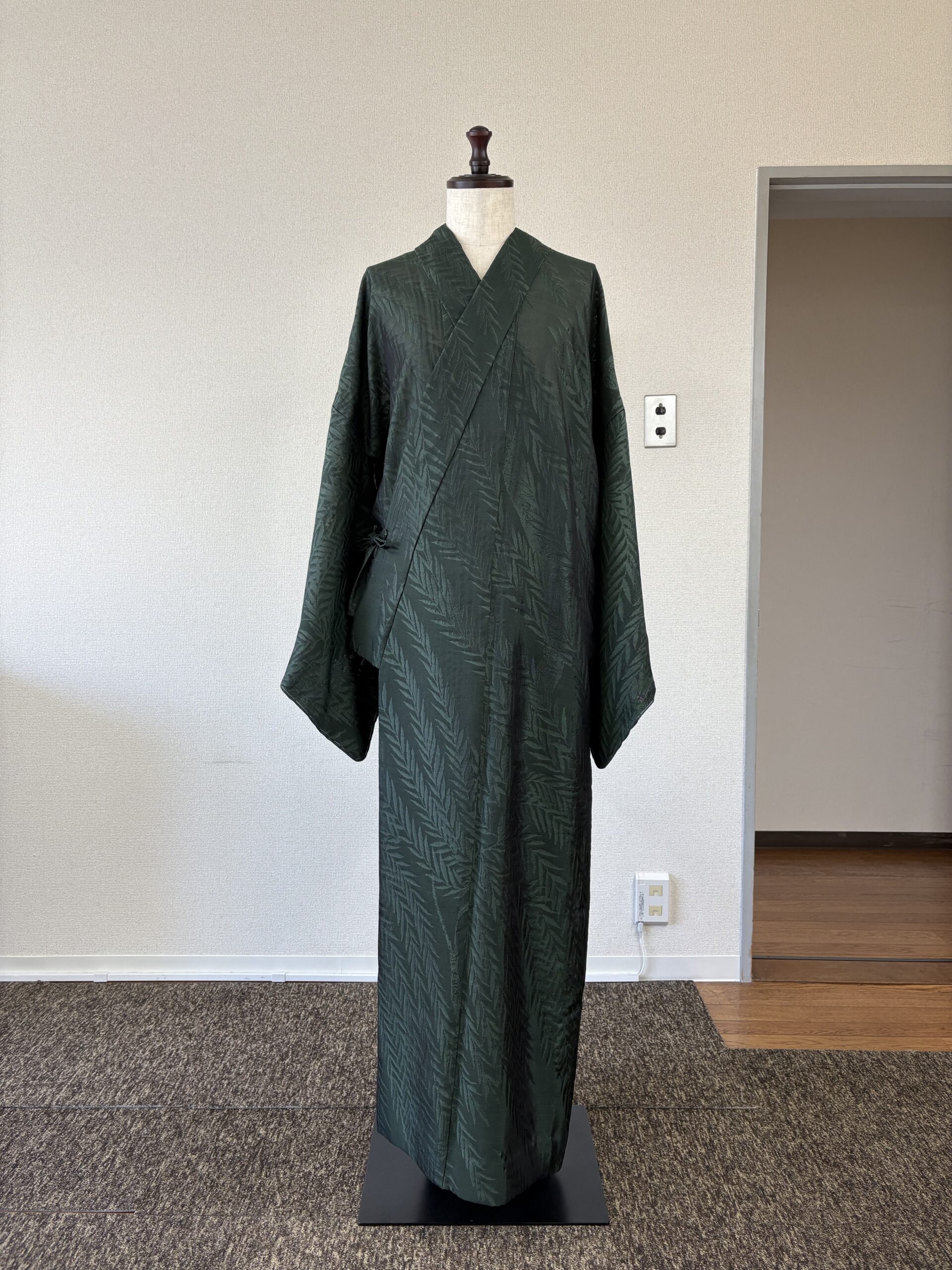 生地の質と色柄が最高に好みの紋紗の着尺からフルレングスの着物衿コートを仕立てました。フルレングスにした理由は、訪問着を着用して移動するとき裾まで隠れるチリ避けにしたいと思ったことと、最終的には羽織として着用したいなと思っているので、両方を叶えるため、今回は生地をフル活用し、着物衿で仕立てました。