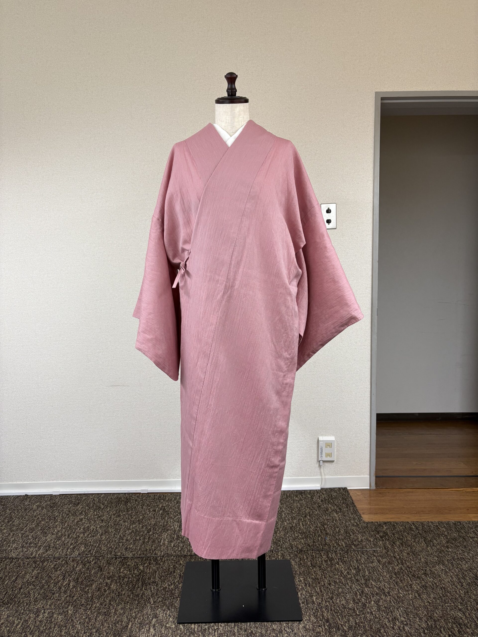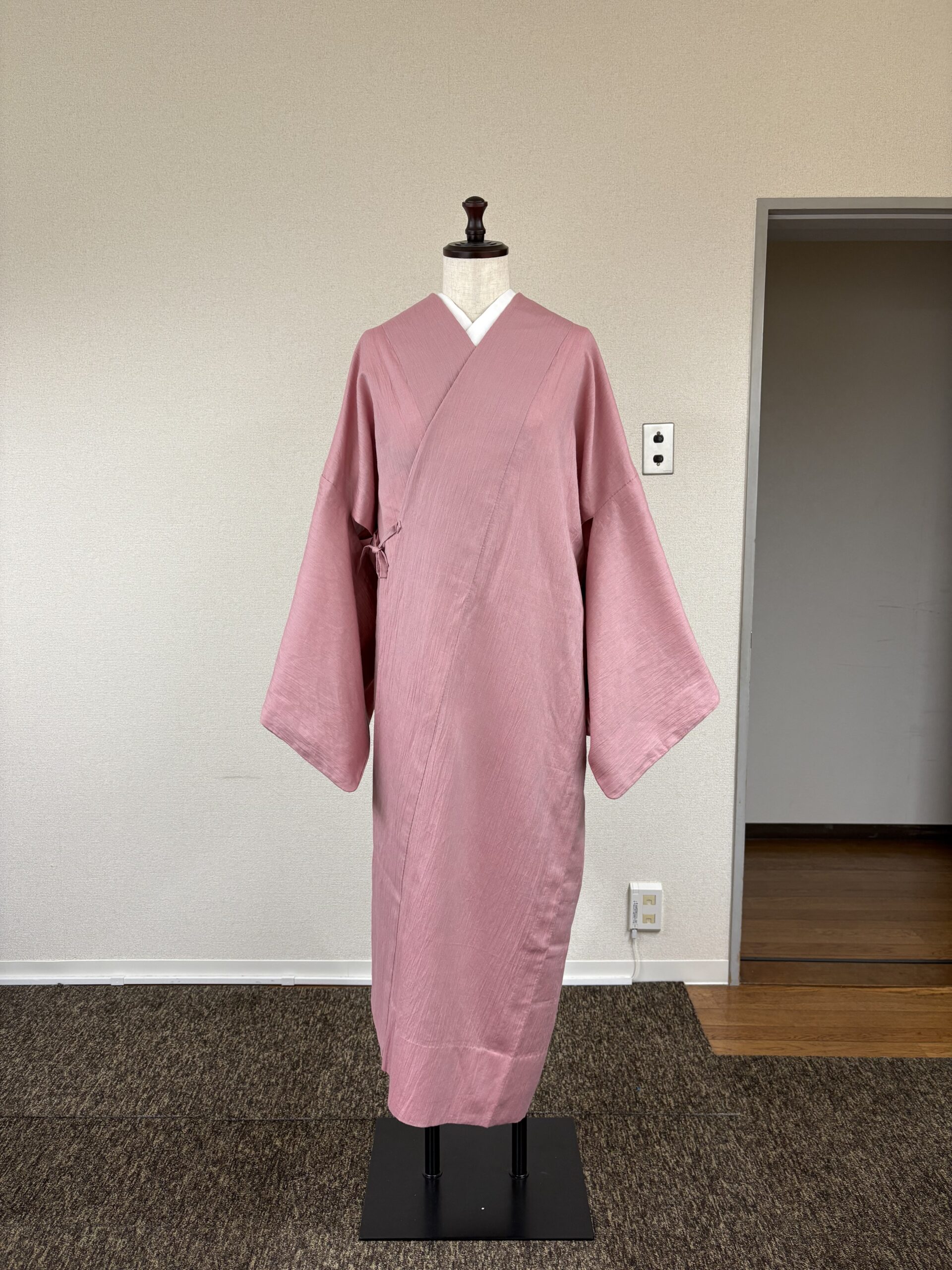 綿麻のピンクの道中着をより良い見栄えになるよう衿付けラインを変えて縫い直したり、紐を変えてみたり、着方を変えてみたりしましたが、どうしてもスッキリとした好みのシルエットを作ることができませんでした。そこで今回は、そもそも道中着と言う物は、どんな願望を叶えることができるコートなのかを考えてみました。