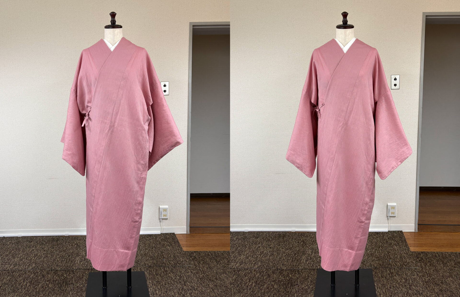 綿麻のピンクの道中着をより良い見栄えになるよう衿付けラインを変えて縫い直したり、紐を変えてみたり、着方を変えてみたりしましたが、どうしてもスッキリとした好みのシルエットを作ることができませんでした。そこで今回は、そもそも道中着と言う物は、どんな願望を叶えることができるコートなのかを考えてみました。