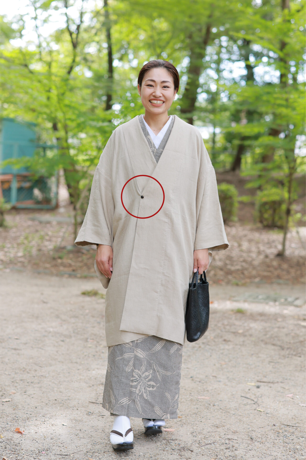 道中着は通常紐で衿を固定しますが、今回はスナップにしました。上前・下前ともにスナップにしたことで衿が固定され、より“シルエットが良い”と感じたのかもしれません。個人的には衿が固定されるので紐よりもスナップが好みです。
