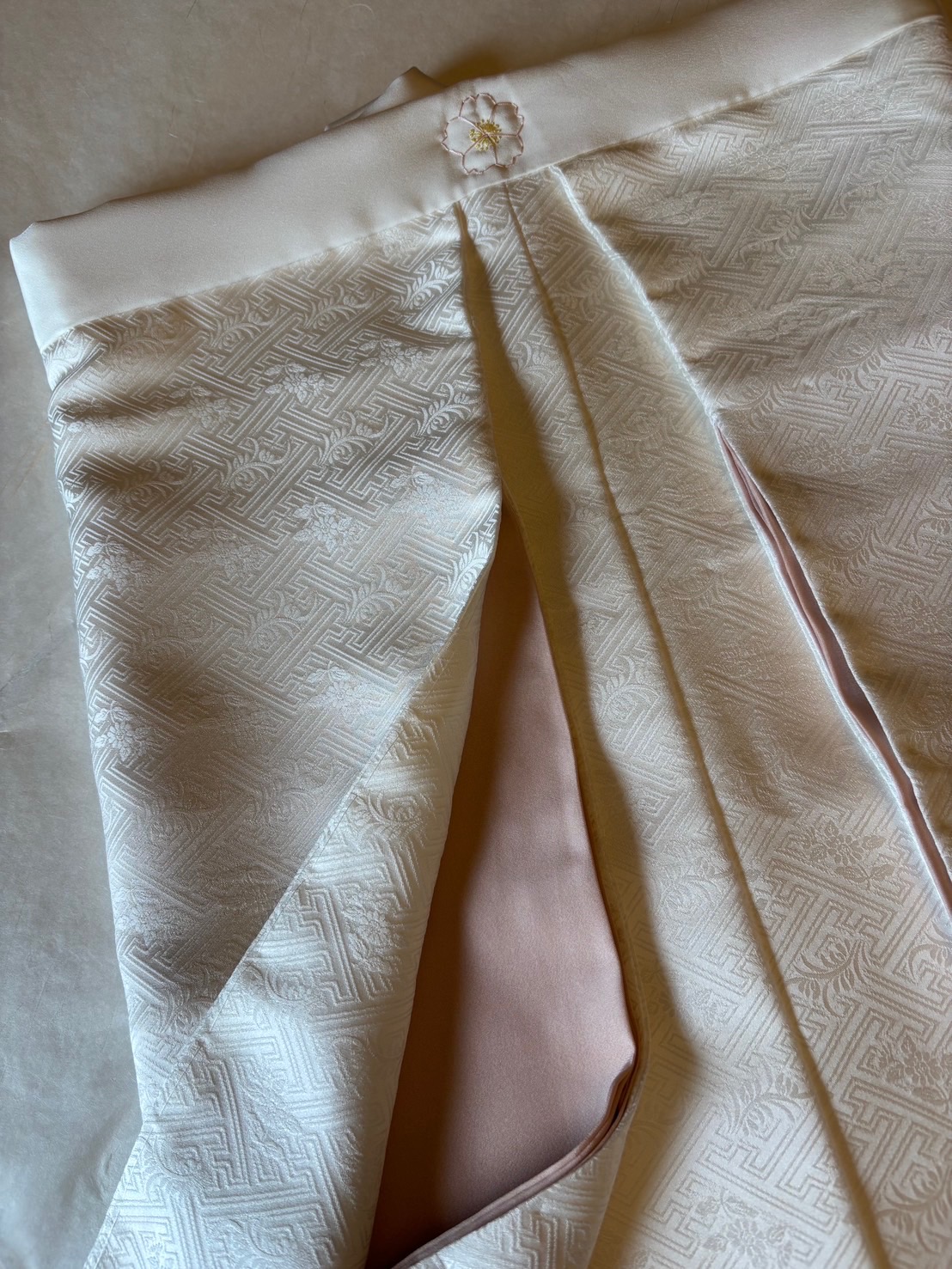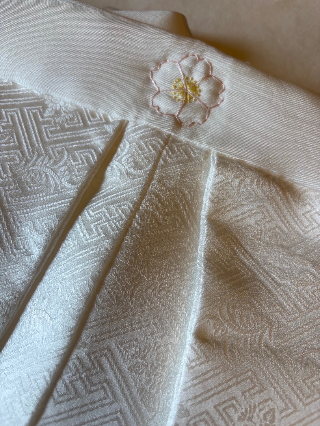 八千代掛けの表地は白いままの反物を使うことが多く、袖の比翼に好きな色を入れて仕立てます。今回は優しいピンク色に染めた比翼を付けました。