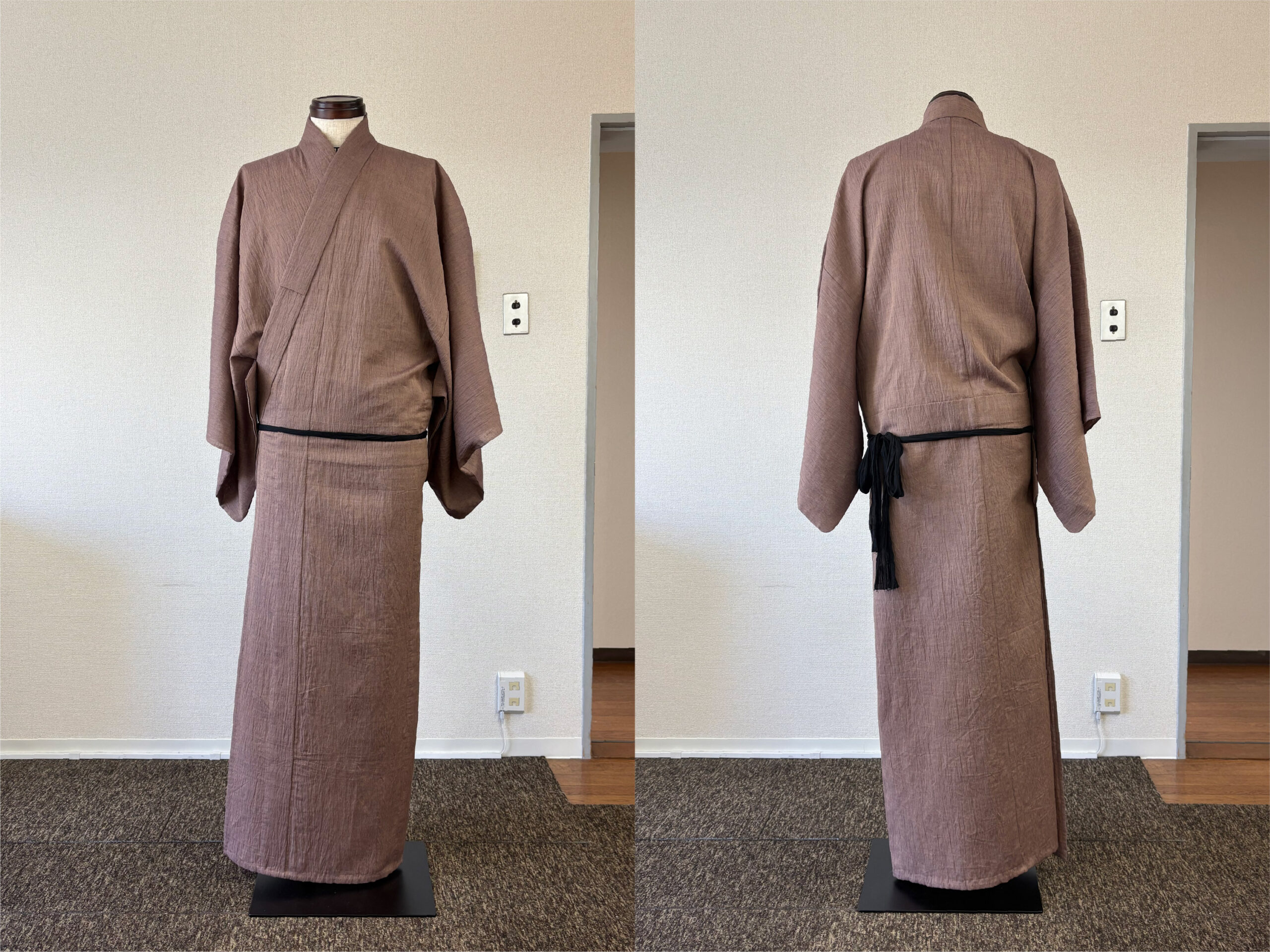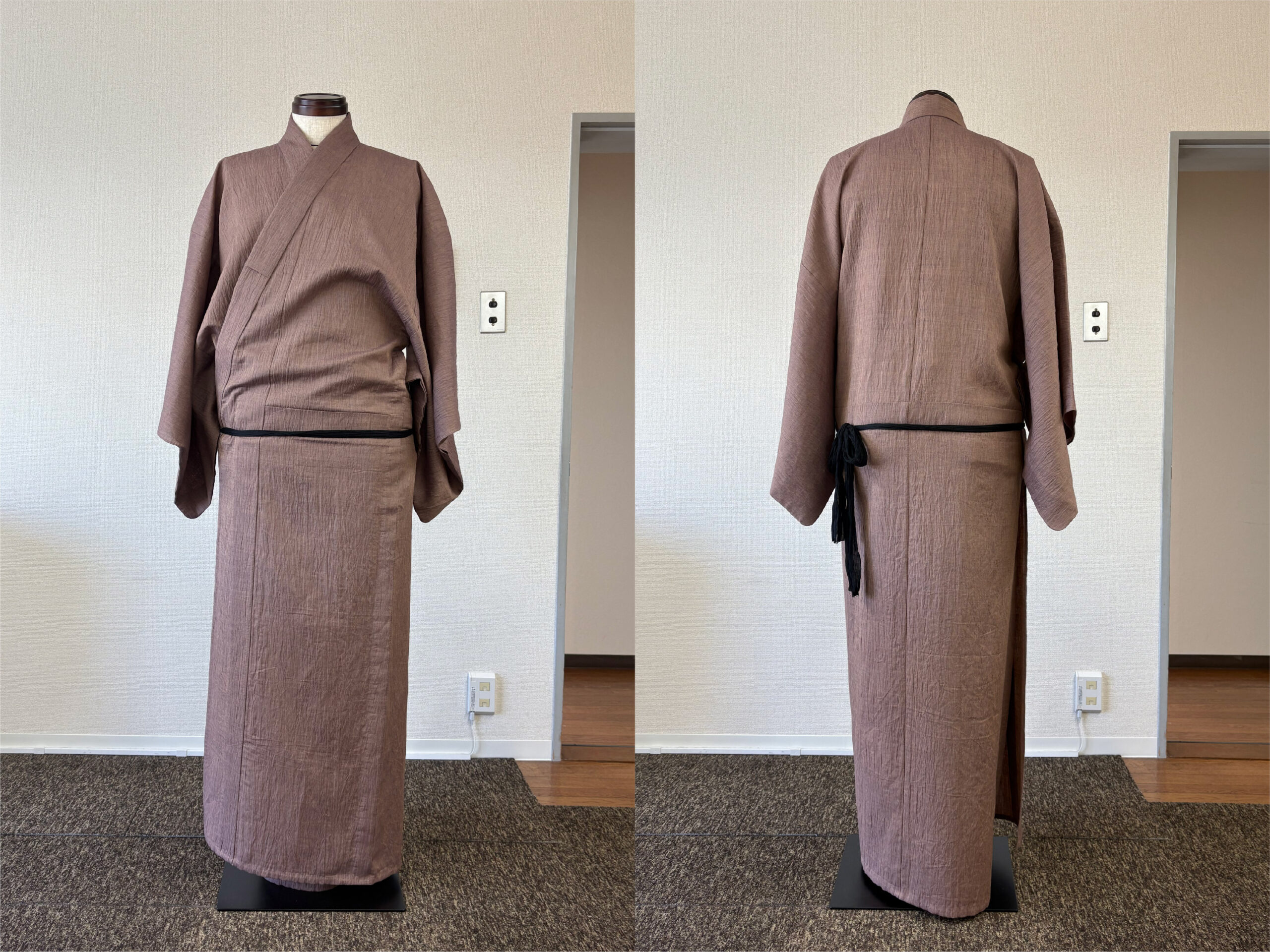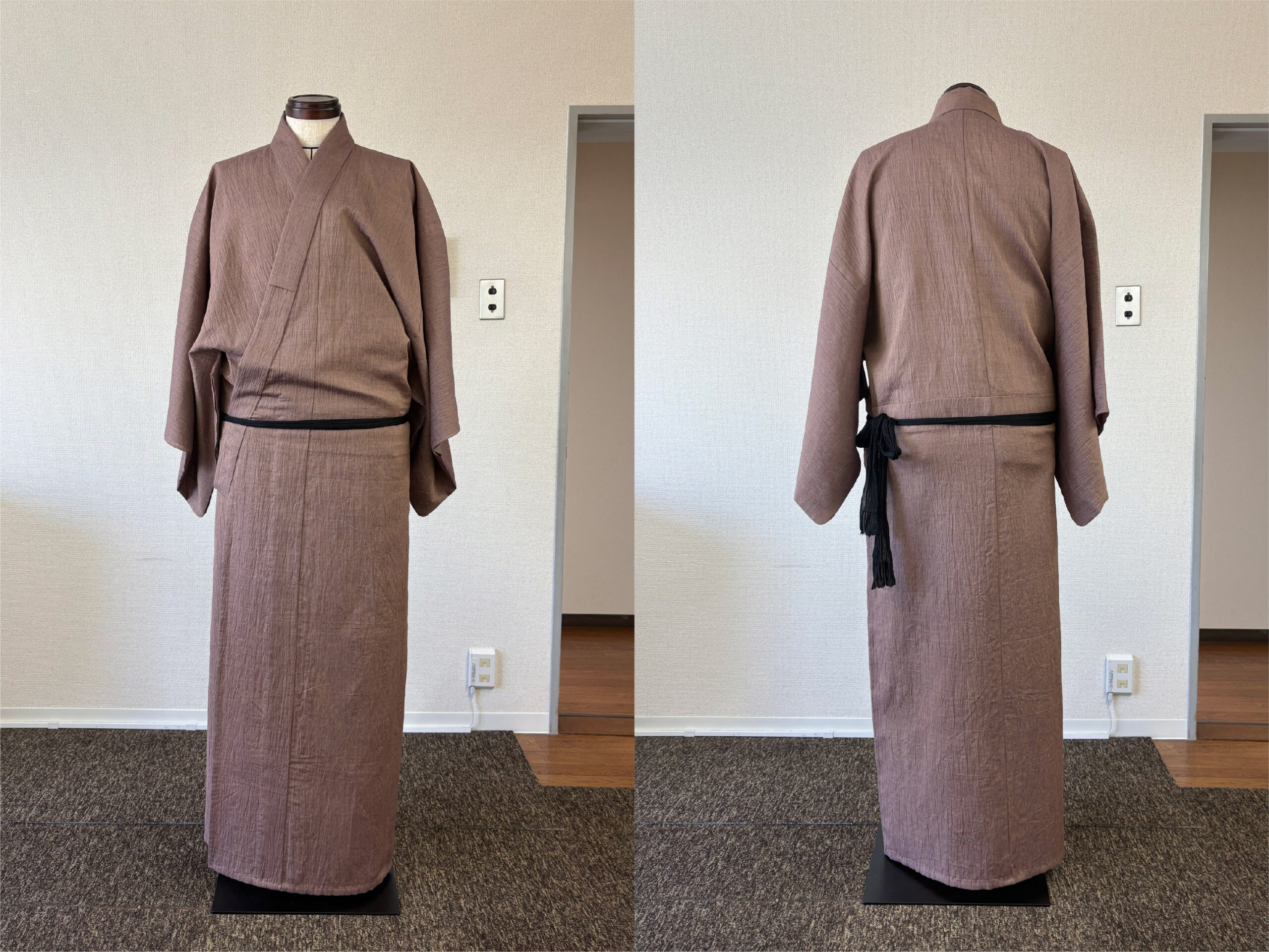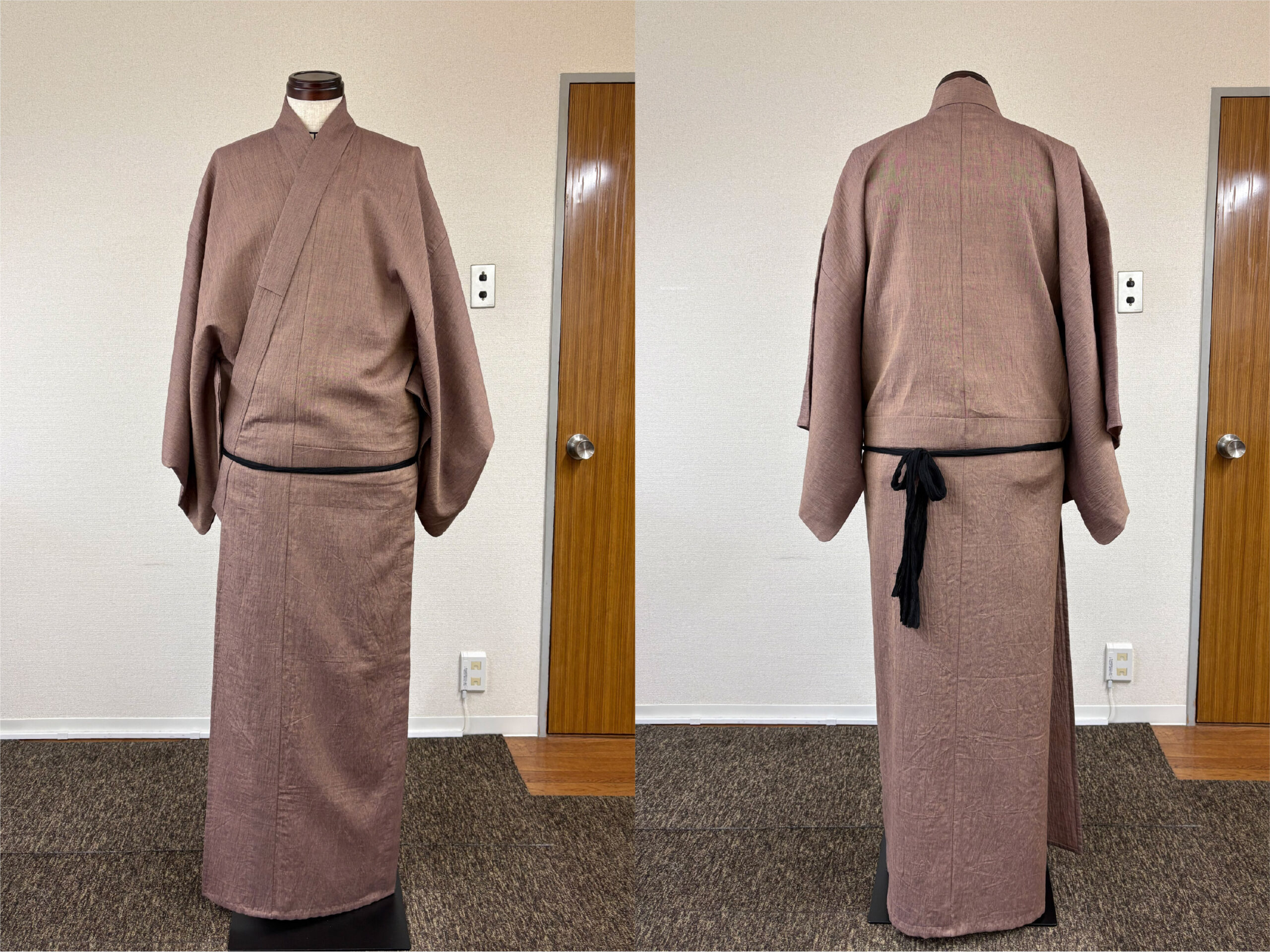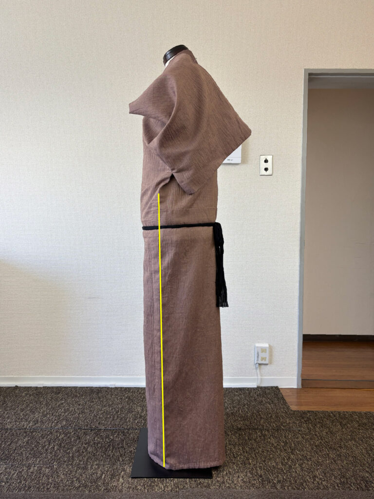 写真からも分かるように、男物は着付けでなんとかできる物ではありません。大切なのは、背中心が必ず背中の中心で真っすぐになるよう着用すること。そして、左右の脇線の位置が良い位置にあることです。腰紐の上側(上半身)と下側(下半身)で脇線がねじれることは着心地の悪さに直結します。左右どちらの脇線も必ず身体の真横にあるような前巾と後巾の寸法のバランスが理想だと思っています。