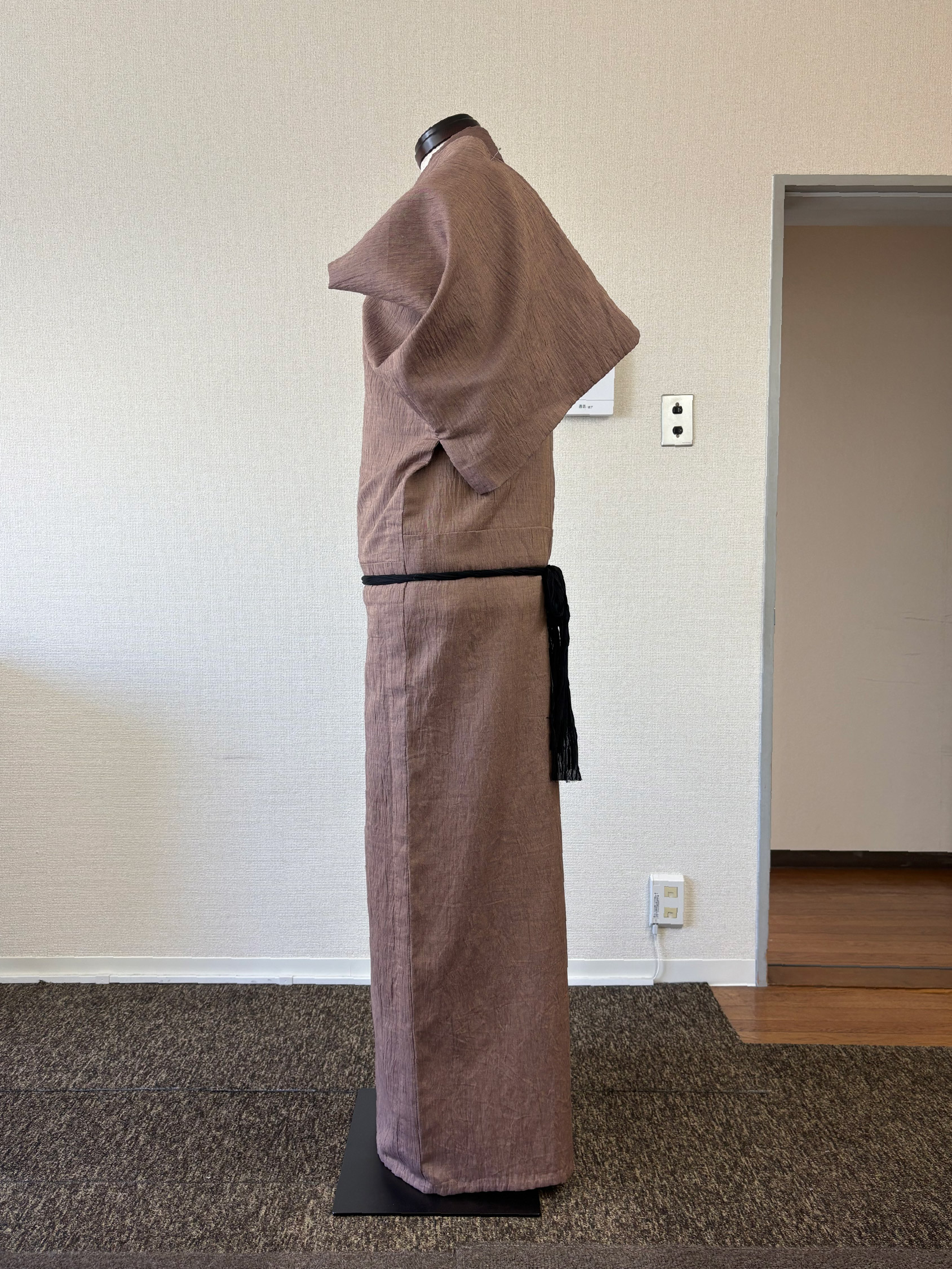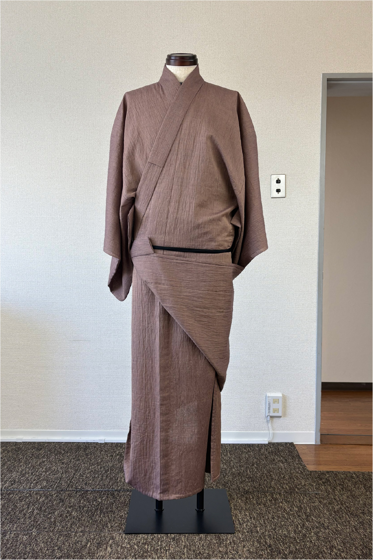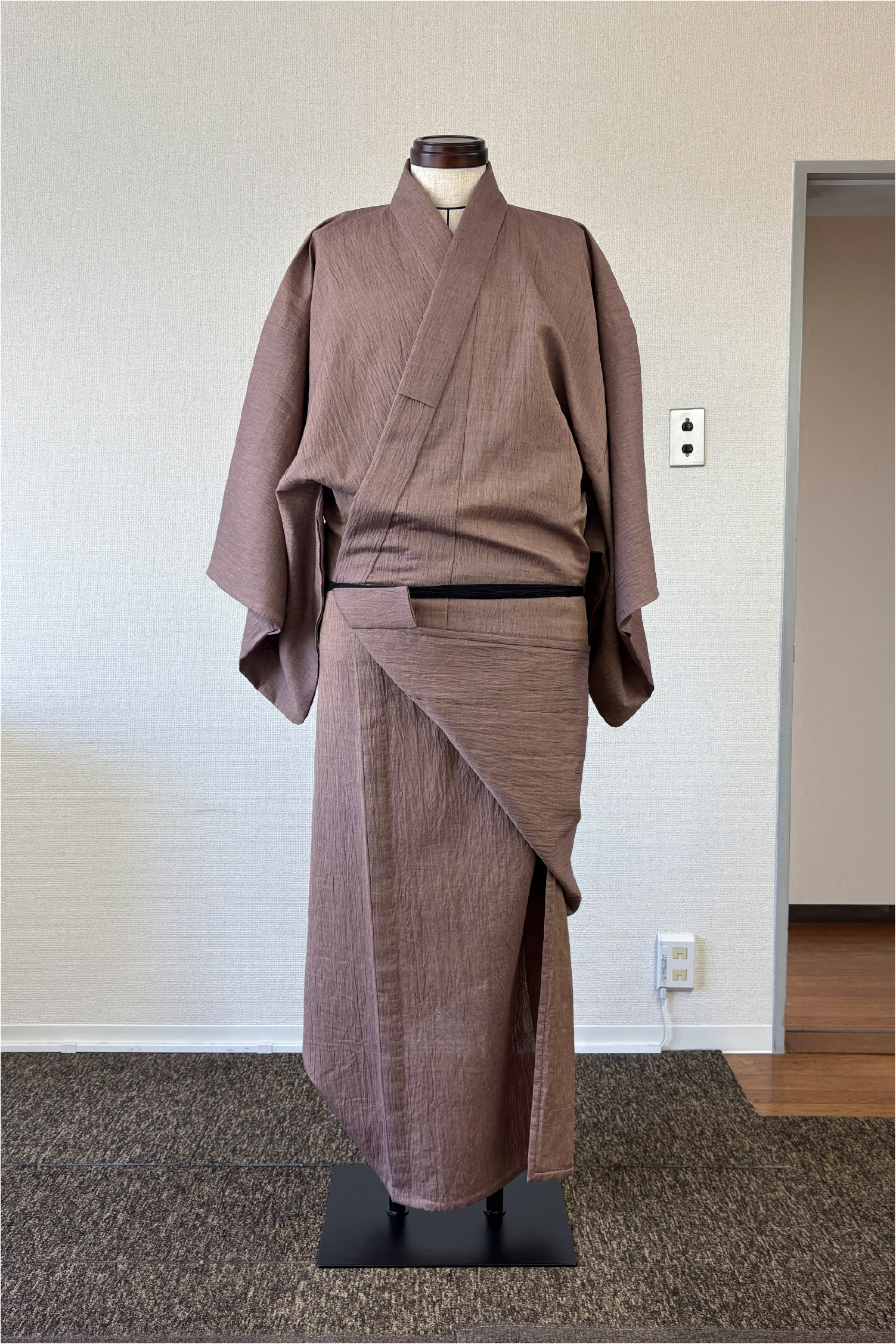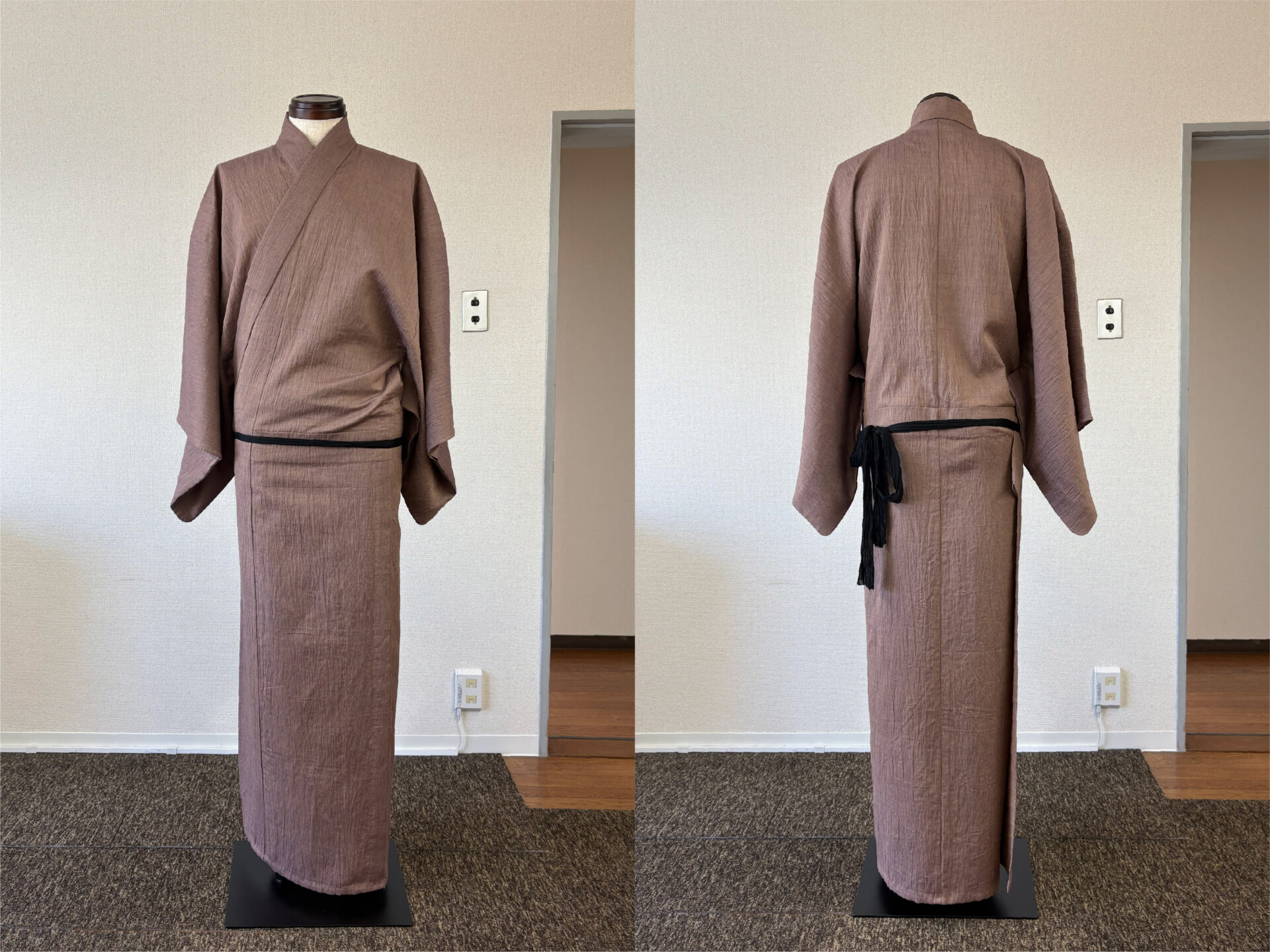 写真からも分かるように、男物は着付けでなんとかできる物ではありません。大切なのは、背中心が必ず背中の中心で真っすぐになるよう着用すること。そして、左右の脇線の位置が良い位置にあることです。腰紐の上側(上半身)と下側(下半身)で脇線がねじれることは着心地の悪さに直結します。左右どちらの脇線も必ず身体の真横にあるような前巾と後巾の寸法のバランスが理想だと思っています。