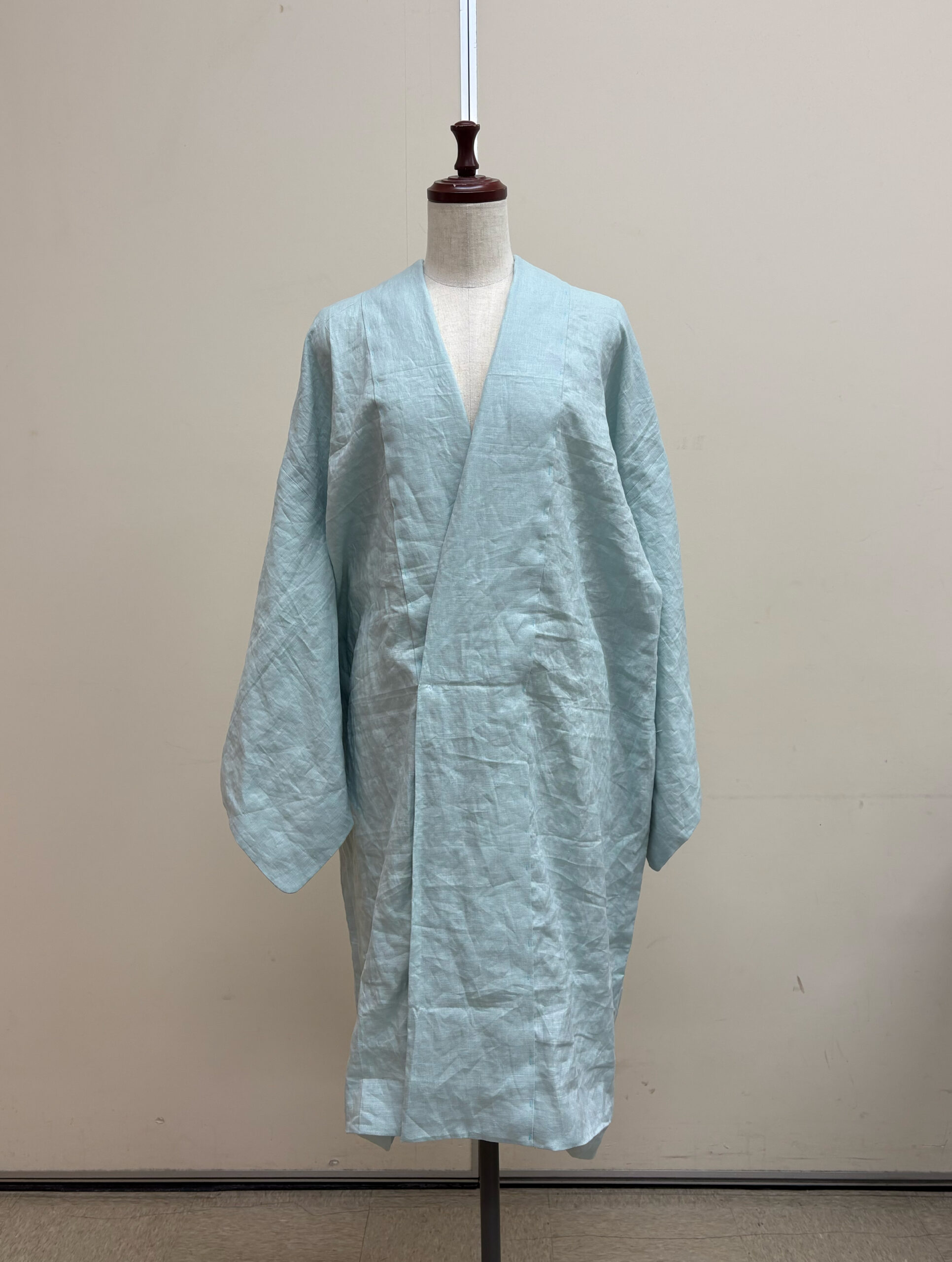 今回の特徴は、衿をボタンで留めるところです。皆さん素敵なボタンを付けてくれました。また、写真をよく見ると衿付けラインがポコポコとしていますが、衿納めがまだ(宿題)なので、しつけをして止めているからです。仕立ての工程数は、着物の中でも断トツで少なく、とても単純な形です。ぜひ色々な生地で増産してもらえると嬉しいです。
